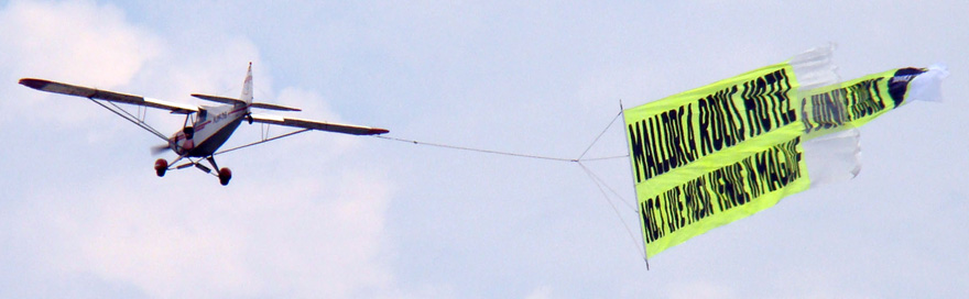 Hemos incorporado a las pancartas tradicionales la posibilidad de alargar una pancarta adicional menor al final de la pancarta, de tal manera que los clientes que quieran o necesiten poner mas información en dicha zona la podrán poner. Es muy adecuado para aquellos clientes que tienen una pancarta genérica de su negocio y en la pancarta adicional colocan el slogan que necesiten en aquel momento con una promoción nueva, una fiesta nueva, horarios, discjockey etc de tal manera que el cliente solo debe cambiar la pancarta pequeña con un considerable ahorro de costes para éste. El tamaño de dicha pancarta es de 8 mts de largo x 165 cms de alto y una cola de visillo de 150 cms. (FOTOS)