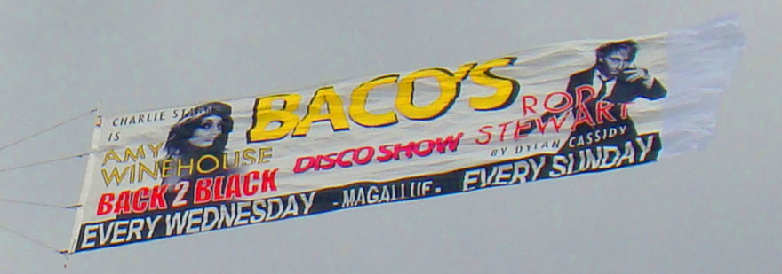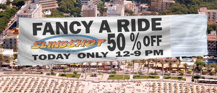 Tras muchos años realizando pancartas de 12 mts x 4 mts, hemos podido comprobar que muchos clientes nos solicitaban para eventos especiales de fiestas, Dj etc el poder poner un texto adicional para anunciar aquel acontecimiento sin tener que realizar una pancarta nueva. En PUBLICIDAD AÉREA ESTOP desde el año 2009 hemos realizado pancartas de 12 mts x 4 mts y a su vez le añadimos una pancarta de 8 mts x 1,65 mts + 1.5 mts de cola de tal manera que el cliente puede insertar una fiesta específica o un Dj sin tener que realizar una pancarta nueva y así teniendo mayor espacio para el resto de pancarta.